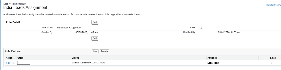 - Enter a Rule Name (e.g., India Leads Assignment)