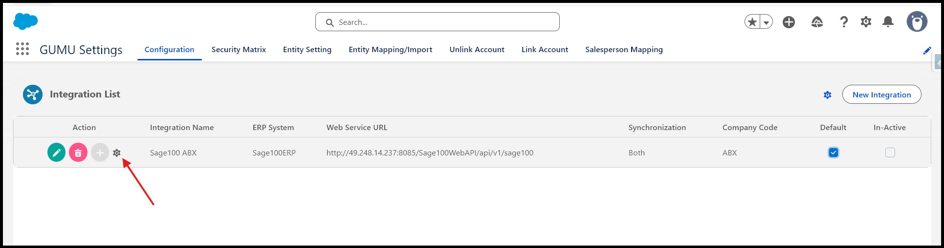 - Click the Settings (⚙️) icon next to the integration to open the ERP configuration window.
