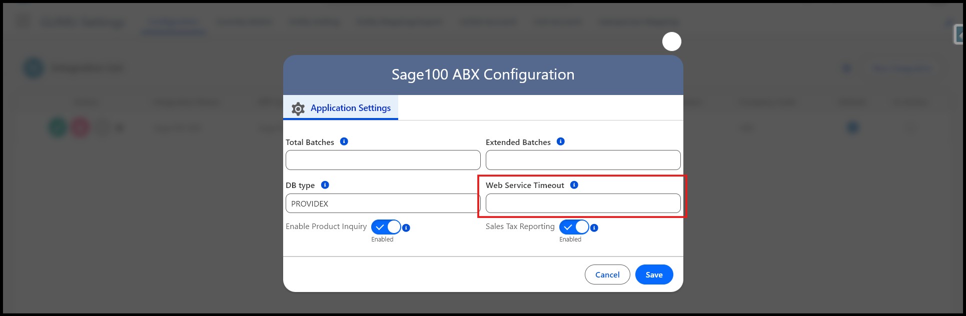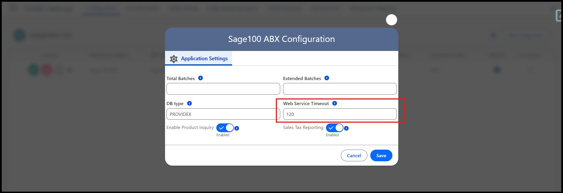 - Under the Application Settings subtab, locate the field Web Service Timeout.