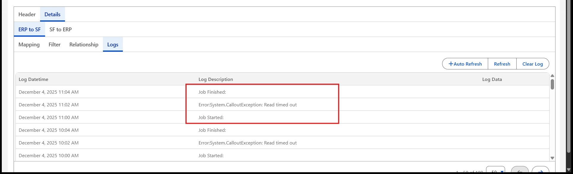 By default, Salesforce enforces a 10-second read timeout for synchronous Apex callouts. If the ERP system does not respond within this timeframe, Salesforce throws a Read Timeout error, which can interrupt data previews and bulk synchronization operations.