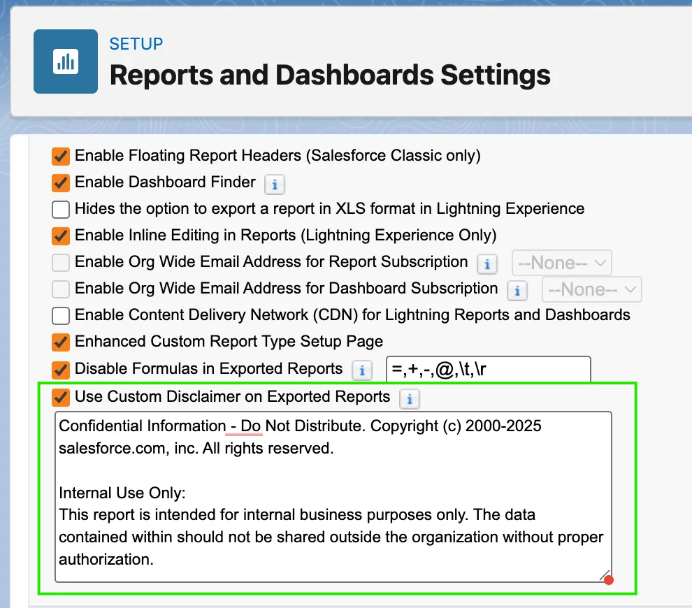 Another valuable enhancement in the Salesforce Spring ’26 reporting updates is the ability to add custom disclaimers to exported reports.