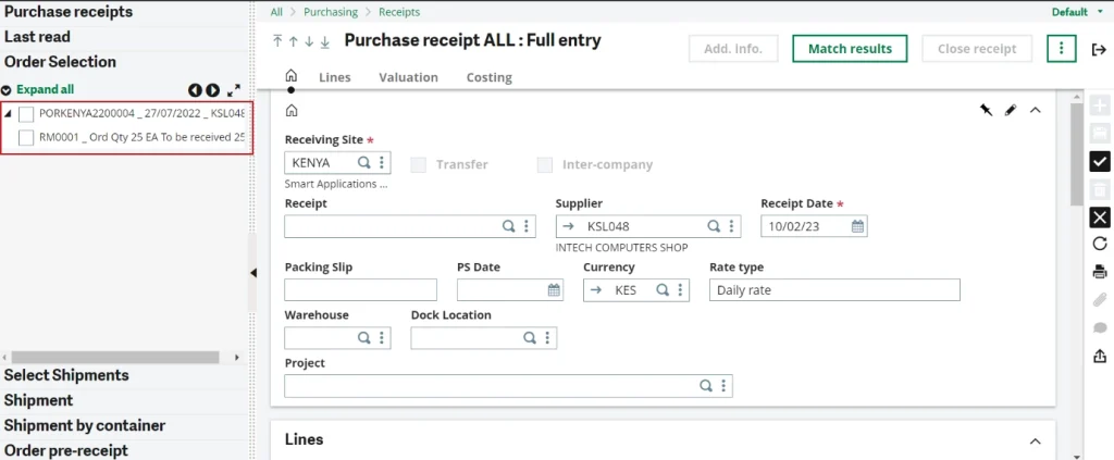 Select the particular supplier & click on the Order selection on the left panel, Purchase Order which was tagged earlier in the wrong Purchase Receipt will be displayed again for selection. Now we can select it & create the proper Purchase Receipt transaction as required.