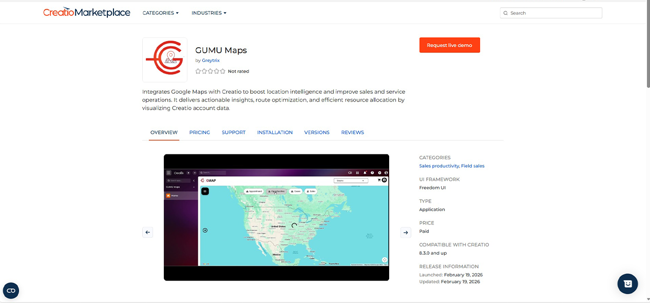 As a location intelligence layer for Creatio it visualizes business data on Google Maps for field planning and execution.